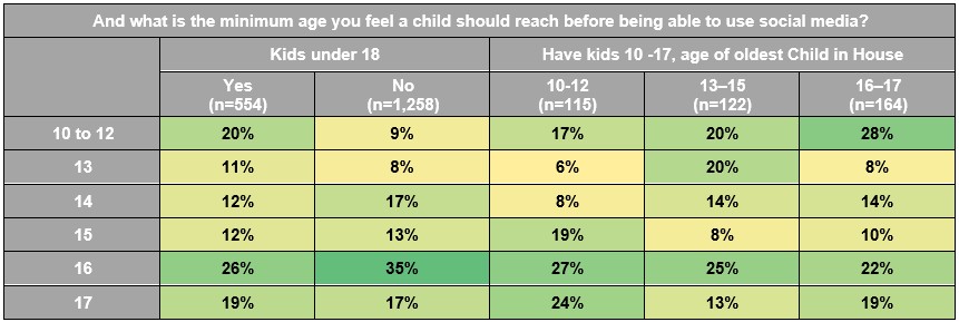 | Oldest child age | Currently using social media | Strongly support full ban | No restrictions in place |