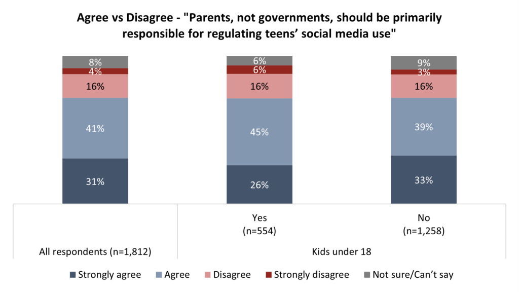 Source: QR1 cross-tabulations, Children PR Tables72% of all respondents, and 70% of those who support a "full ban," agree with the statement "parents, not governments, should be primarily responsible for regulating teens' social media use." Only 20% say government should be primarily responsible.