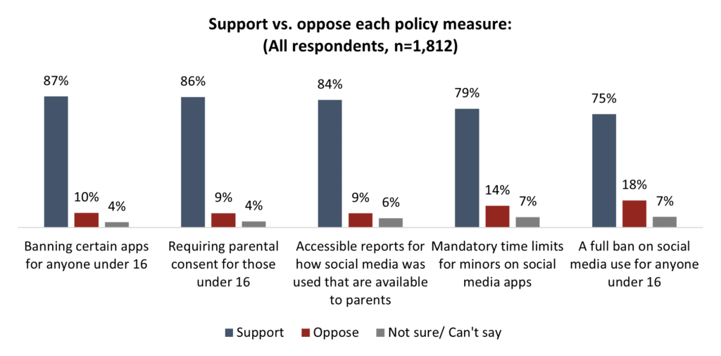 Respondents were presented with five possible policy measures. A blanket ban on all social media for under-16s received the lowest support of any option. Design-regulation and transparency measures including banning specific apps only, requiring parental consent, in-app usage reports, and mandatory time limits, all polled higher.